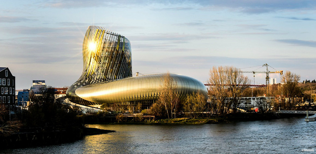 Anclado en las orillas del río Garona, la Ciudad del Vino es un monumento para maravillarse. La arquitectura del edificio es completamente evocadora. Además también apela a la imaginación: una torre con más de cincuenta y cinco metros con un movimiento circular de cuello de cisne, en una curva infinita que parece cambiar de forma desde diferentes ángulos.